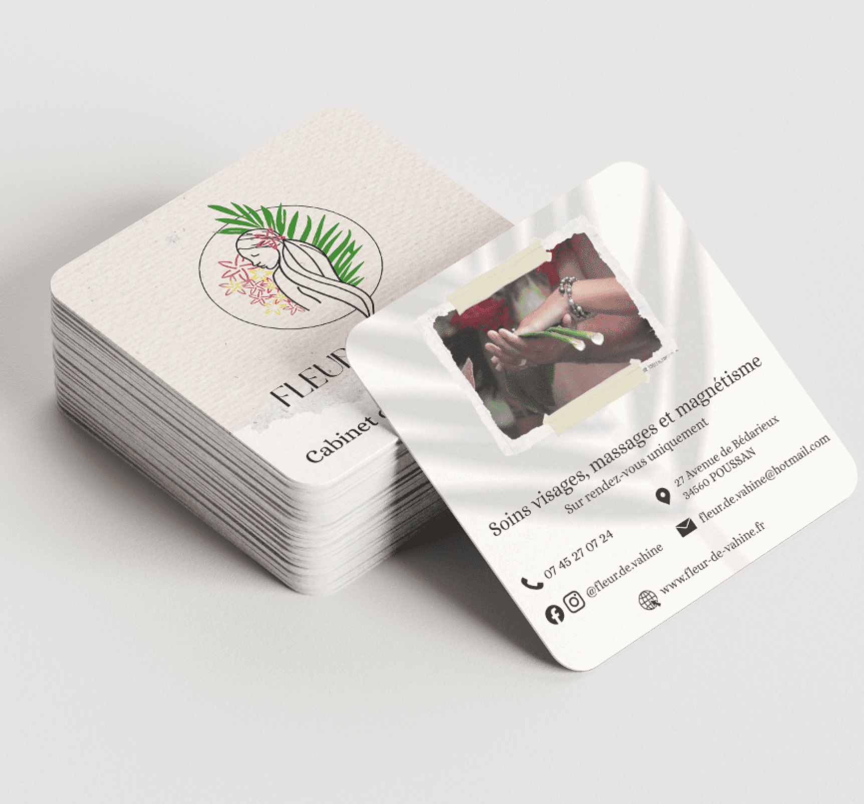 Le cabinet Fleurs de Vahiné venait tout juste de se lancer et ne disposait d’aucune identité visuelle ni support de communication.